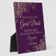 This elegant self standing sign or plaque will welcome guests to sign your wedding guest book. It features a simple sophisticated yet fancy design with gold text on a deep plum purple background with a gold faux foil frilly floral filigree in the corners.