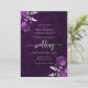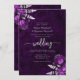 This elegant wedding invitation features plum floral bouquets set off with silver faux foil greenery in two corners, on a background image of plum purple watercolor agate. The customisable text combines serif, italic and handwriting fonts. The reverse side features a matching purple and silver floral and agate design.