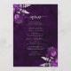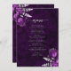 This elegant wedding menu features plum floral bouquets set off with silver faux foil greenery in two corners, on a background image of purple watercolor agate. The customisable text combines silver grey serif and handwriting fonts. The reverse side features a matching purple and silver floral and agate design.