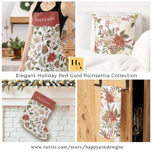 christmas personalisedholiday apronfloralpersonalisedpoinsettia pinecone holly berriesbakingelegant festive classicterracotta red gold white