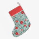 Stylish personalised Christmas stocking featuring your name at the top in a cute white script font and a red background. The design features a pattern of red poinsettia flowers and berries with teal foliage against an aqua background. The design repeats on the back.