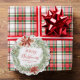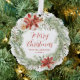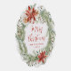 Elegant, floral Christmas ornament card featuring "Merry Christmas" in a red script encircled by a wreath of red watercolor poinsettias, cream roses, pine boughs, holly berries, and other winter greenery. Personalise the front of the non-photo holiday ornament card with your family name and year shown below in red lettering. The back of the rustic holiday ornament card displays your personal message in white lettering with a red background.