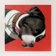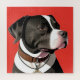 Stylised illustration of a black and white dog in profile view, with vibrant red backdrop emphasizing the dog's elegant silhouette while showcasing its charm.