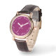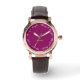 An elegant and festive wristwatch, with the words 'Merry & Bright' repeated around the edge in elegant script typography. The text is white, on a rich blackcurrant magenta face. Personalise this stylish watch with your name or other text for an individual finishing touch.