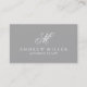 An elegant, professional business card that can be used for any industry. The business card features a fancy script custom monogram, white text, grey background, and simple layout to showcase your name/business name. Change the font style, move text, and more, by clicking on the Customise It button.