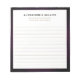 A professional lined notepad with a simple modern design. Custom name and title position role and company or custom text presented on a simple white background framed in purple with golden accents. Personalise using the fields provided or use the 'message' button to contact the designer for help.