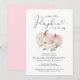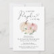 An elegant autumn-themed girl baby shower invitation with "a sweet little pumpkin is on her way" in a mix of a soft grey font and a script with a heart swash and watercolors of pink and cream pumpkins and floral bouquets.