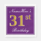 This simple and elegant paper napkin design features a message like "NameHere’s 31st Birthday" (with the "31st" having a faux gold-like colouring look) within a purple-coloured square area featuring a simple border outline. The name is in a white-coloured script-like text, and can be customised. Napkins like these could perhaps be used at a birthday party for somebody who is celebrating their thirty first birthday. [~Z0000140]