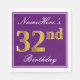 This simple and elegant paper napkin design features a message like "NameHere’s 32nd Birthday" (with the "32nd" having a faux gold-like colouring look) within a purple-coloured square area featuring a simple border outline. The name is in a white-coloured script-like text, and can be customised. Napkins like these could perhaps be used at a birthday party for somebody who is celebrating their thirty second birthday. [~Z0000140]