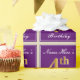 This simple and elegant wrapping paper design features a personalised message like "Name-Here’s 4th Birthday" (with the "4th" having a faux/imitation gold-like colouring look) within a purple-coloured square area featuring a simple border outline. The name is in an elegant white-coloured script-like text, and can be personalised. Wrapping paper like this could perhaps be used when wrapping birthday gifts for somebody who is celebrating their fourth birthday. [~Z0000220]