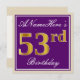This simple and elegant birthday party invitation design features a personalised message like "ANameHere’s 53rd Birthday" (with the "53rd" having a faux/imitation gold-like colouring look) within a purple-coloured square area featuring a simple border outline. The name is in an elegant white-coloured script-like text, and can be customised. The back features personalised invitation details. A birthday party invitation like this could perhaps be used when inviting people to a birthday party being held for somebody who is celebrating their fifty third birthday. [~Z0000226]