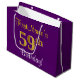 This simple, elegant birthday gift bag design features a personalised message like "FirstName’s 59th Birthday!" (with the "59th" having a faux/imitation gold-like colouring look) on a purple coloured background. The name is in script-like, yellow-coloured text, and can be personalised. A personalised birthday themed gift bag like this could perhaps be used when giving a present or gift to somebody who is celebrating their fifty ninth birthday. [~Z0000255]
