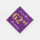 This simple and elegant paper napkin design features a message like "NameHere’s 62nd Birthday" (with the "62nd" having a faux gold-like colouring look) within a purple-coloured square area featuring a simple border outline. The name is in a white-coloured script-like text, and can be personalised. Napkins like these could perhaps be used at a birthday party for somebody who is celebrating their sixty second birthday. [~Z0000140]