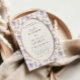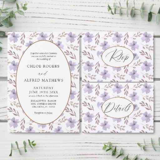 You will adore this beautiful wedding invitation featuring delicate watercolor artwork of soft purple flowers and warm terracotta foliage, arranged in an elegant pattern. The design is centred around an oval window, perfectly framing your wedding details in a stylish and luxurious way with a faux gold edge. The combination of the subtle floral elements with earthy terracotta tones creates a warm and romantic invitation that complements any wedding theme, adding a touch of natural elegance to your special day. Easily customisable, this invitation makes a stunning first impression for your celebration.