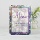 Elegant Purple Floral Wedding Menu designed with a beautiful bouquet of flowers in soft shades of purple with purple border and text. The front text includes: Menu, The Bride and Groom's first Names and Wedding Date. The reverse text includes: Your Appetizer, Entre and Dessert Selections. To personalise, simply insert your details into our easy template, replacing the sample text. Be sure to view the complete Elegant purple Floral Wedding Collection for matching cards and accessories.