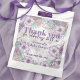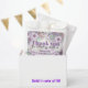 This is a charming customisable Baby Shower favour bag. The background of the bag is adorned with an intricate hand-drawn floral design, creating a vibrant yet delicate backdrop. The blossoming flowers are detailed and varied, painted in various shades of purple, lavender, green, and white. This delightful floral pattern sets a tone of elegance and celebration, perfect for a baby shower.