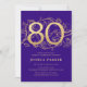 Elegant purple gold 80th birthday party invitation. Customisable modern feminine design featuring roses botanical accents and faux glitter gold. Simple floral invite card perfect for a stylish female bday celebration. Personalise with your own details. Printed Zazzle invitations or instant download digital printable template.