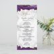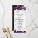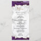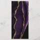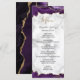 This elegant, modern wedding menu features top and bottom borders of purple watercolor agate trimmed with gold faux glitter. The text appears in elegant gold-coloured handwriting script and black italic and copperplate fonts on a grey and white marble background. The agate design is repeated on the reverse.