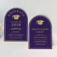 Elegant purple arch-shaped college graduation party invitation featuring a gold grad cap and the graduate's name, class year, college or university, degree and major or honours in classic gold serif typography. On the back, add your party details.