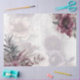A stunning array of flowers in shades of purple, pink, and maroon. The intricate details of the petals and centres create a sense of elegance and beauty. The flowers are complemented by delicate leaves and stems in muted tones, adding a touch of natural grace to the design.