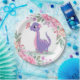 I hope you'll enjoy this purple and pink dinosaur with a pink butterfly at its nose and botanical flowers. Matching products and invitations to match are available.