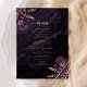 This elegant wedding menu features purple floral bouquets set off with rose gold faux foil greenery in two corners, on a background image of purple watercolor agate. The customisable text combines rose pink serif and handwriting fonts. The reverse side features a matching purple and rose gold floral and agate design.