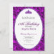This elegant purple floral 18th birthday debut invitation has purple roses, a tiara crown, and a purple glitter oval with a personalizable template to create your own message. The invitation template is customizable in the listing editor and is also available as a digital download that's printable after you personalize it. The back has purple roses covering the entire surface to create and classic and classy mood for your event.