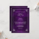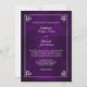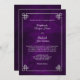 This is a stylish, rich looking wedding invitation for any season. A classy, corner decorated geometric silver frame encloses your wedding text, which is also in silver. The images and text are placed on a royal purple gradient background that almost glows! The back of the invitation has the same purple background. Very elegant!