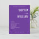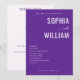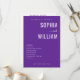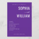 This wedding program features a modern, minimalist design with a deep purple background and crisp white text. The layout is clean and elegant, focusing on typography to highlight the names "Sophia" and "William," which are prominently displayed in bold serif letters with a stylish cursive "and" connecting them. The ceremony details are neatly listed below, ensuring clarity and easy readability, while ample negative space emphasizes simplicity and sophistication. Perfect for couples seeking a formal yet approachable aesthetic, this design captures the joyous occasion of their union.