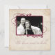 Invitation features parchment paper texture with frilly red wine coloured lines bordering a frame around your engagement photograph with text that says "to have and to hold" on one side with your wedding details on the other with an orange border around the edges of the invitation.