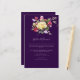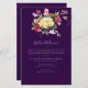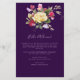Elegant bouquet of yellow rose and pink, red, lilac sweet pea flowers, green leaves and buds. Dark purple background. Elegant lettering. Bold, contrast and striking wedding design. Artwork is based off a vintage card.