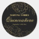 Designed for your Quinceañera or Sweet 15 Celebration. Decorate your envelopes, favours, keepsakes and gift wrap with these elegant Quinceanera stickers. A modern design in black and gold with sketched floral arrangements, to frame your custom text. The wording reads "[quince name] Quinceañera [date]" in neat but decorative calligraphy and a classic serif font. The template is set up ready for you to edit (or delete) any, or all, of the sample wording. Please browse our store for coordinating items for your Quinceanera Birthday Party.