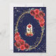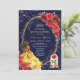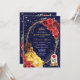 Featuring a regal navy blue background, ornate golden filigree accents, vibrant red roses, and a delicate enchanted rose encased in glass, this design exudes sophistication and fairy tale charm. The highlight is the stunning illustration of a young woman in a shimmering golden gown, symbolising the grace and beauty of this special occasion.