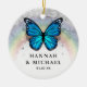 Celebrate life’s most cherished moments with this elegant personalised butterfly ornament, featuring original watercolor art by Raphaela Wilson. The front showcases a beautiful large blue monarch butterfly (customisable to any colour), while the back is adorned with a delicate arch of blue and silver butterflies. The background features a soft grey sparkling stone texture with rainbows, all of which are optional for a truly custom look. Add a name and wedding date for a heartfelt treasure, perfect for weddings, quinceañeras, a first Christmas, memorial keepsake or any special occasion where these whimsical garden beauties bring meaning. A timeless and elegant gift, this ornament captures the beauty of transformation and new beginnings. Category: blue butterfly ornaments for her / daughter; blue monarch butterfly holiday ornaments; and ceramic template blue butterfly ornament for Christmas tree. Blue butterfly themed Christmas ornament colours: royal blue, dark blue, navy, sapphire, light grey, dark grey, black and white (plus multicolor rainbow hues).