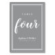 This design was created for smaller intimate wedding celebrations. Simple, minimalist and elegant Wedding Table Number FOUR design features a contemporary design with a double frame border in crisp white on a sophisticated ultimate grey background. The chic design provides timeless yet modern sophistication. Personalise wedding table design with your wedding details in crisp white lettering and script. The back of the card is a duplicate of the front. Order one for every table with the individual table numbers.
