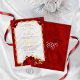 Enjoy luxury at an affordable price with this elegant red floral wedding invitation with REAL GOLD FOIL frame and accents, as well as selected script text. A faux red metallic background, white satin, and a gold filigree jewelled frame combine with rich red roses for the ultimate elegant wedding design. The text in classic formal fonts can be easily personalised for your own special day. On the back is a decorative script monogram in complementary colours.