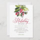 Festive holiday soirée party invitation design features a watercolor Christmas floral mistletoe ball with elegant deep ruby red script and custom text that can be fully personalised. Back of card includes a red background background with white polka dots pattern. Red, green, and soft black colour scheme.