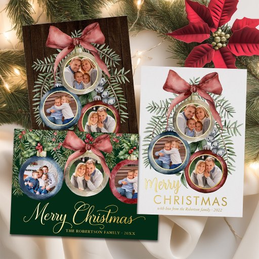 With elegant classic Merry Christmas script in real gold foil, this luxurious Christmas card with a traditional feel features 3 photo templates in ornaments, decorated with a variety of holiday watercolor greenery, holly berries, and a red bow. The deep red background shows off the gold foil to perfection. If you need more matching products or other colorways, please contact me through Zazzle Chat.