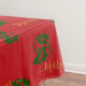 Elegant red and green Christmas holly tablecloth, with the words MERRY CHRISTMAS in gold script typography. The text is CUSTOMIZABLE so you can create your own text, eg. add your name.