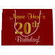 This simple, elegant birthday gift bag design features a personalised message like "Name-Here’s 20th Birthday!" (with the "20th" having a faux/imitation gold-like colouring look) on a red coloured background. The name is in script-like, yellow-coloured text, and can be customised. A personalised birthday gift bag like this could perhaps be used when giving a present or gift to somebody who is celebrating their twentieth birthday. [~Z0000253]