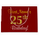 This simple, elegant birthday gift bag design features a personalised message like "FirstName’s 25th Birthday!" (with the "25th" having a faux/imitation gold-like colouring look) on a red coloured background. The name is in script-like, yellow-coloured text, and can be customised. A personalised birthday gift bag like this could perhaps be used when giving a present or gift to somebody who is celebrating their twenty fifth birthday. [~Z0000253]