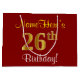 This simple, elegant birthday gift bag design features a personalised message like "NameHere’s 26th Birthday!" (with the "26th" having a faux/imitation gold-like colouring look) on a red coloured background. The name is in script-like, yellow-coloured text, and can be customised. A personalised birthday gift bag like this could perhaps be used when giving a present or gift to somebody who is celebrating their twenty sixth birthday. [~Z0000253]