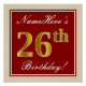 This simple and elegant birthday party poster design features a personalised message like "NameHere’s 26th Birthday!" (with the "26th" having a faux/imitation gold-like colouring look) within a red-coloured square area featuring a simple border outline. The name is in an elegant white-coloured script-like text, and can be personalised. A personalised birthday party poster like this could perhaps be used as a decoration at a party being held for somebody who is celebrating their twenty sixth birthday. [~Z0000234]
