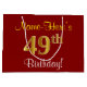 This simple, elegant birthday gift bag design features a personalised message like "Name-Here’s 49th Birthday!" (with the "49th" having a faux/imitation gold-like colouring look) on a red coloured background. The name is in script-like, yellow-coloured text, and can be customised. A personalised birthday gift bag like this could perhaps be used when giving a present or gift to somebody who is celebrating their forty ninth birthday. [~Z0000253]
