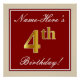 This simple and elegant birthday party poster design features a personalised message like "Name-Here’s 4th Birthday!" (with the "4th" having a faux/imitation gold-like colouring look) within a red-coloured square area featuring a simple border outline. The name is in an elegant white-coloured script-like text, and can be personalised. A personalised birthday party poster like this could perhaps be used as a decoration at a party being held for somebody who is celebrating their fourth birthday. [~Z0000234]