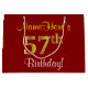 This simple, elegant birthday gift bag design features a personalised message like "NameHere’s 57th Birthday!" (with the "57th" having a faux/imitation gold-like colouring look) on a red coloured background. The name is in script-like, yellow-coloured text, and can be personalised. A personalised birthday gift bag like this could perhaps be used when giving a present or gift to somebody who is celebrating their fifty seventh birthday. [~Z0000253]