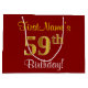 This simple, elegant birthday gift bag design features a personalised message like "FirstName’s 59th Birthday!" (with the "59th" having a faux/imitation gold-like colouring look) on a red coloured background. The name is in script-like, yellow-coloured text, and can be customised. A personalised birthday gift bag like this could perhaps be used when giving a present or gift to somebody who is celebrating their fifty ninth birthday. [~Z0000253]