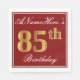This simple and elegant paper napkin design features a message like "ANameHere’s 85th Birthday" (with the "85th" having a faux gold-like colouring) within a red-coloured square area featuring a simple border outline. The name is in a white-coloured script-like text, and can be personalised. Napkins like these could perhaps be used at a birthday party for somebody who is celebrating their eighty fifth birthday. [~Z0000138]