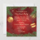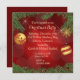 This is an elegant holiday party invitation, with your party information in gold at the centre. The top and bottom have a border of green pine needles and pine cones. A few gold stars sparkle in the background, and two red and gold decorated tree bulbs hang at the sides. The images and text are placed on a gradient red background with a subtle circle pattern. The back of the invitation is solid matching red. It's easy to adapt this invitation for a corporation or business. If you'd like to add additional text to the back, choose Customise It. *Thanks to Scrap and Tubes for clip art used in this design.