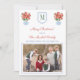 ** Photo credit: Photography © Storytree Studios, Stanford, CA ** Preppy Happy Holidays photo card design featuring twin red poinsettia plants, in blue and white planters. In between these is a crest shape with space for a single letter monogram. The reverse side features a pattern made up of ginger jar vases and the same poinsettia plant. If preferred, you can easily add your photo on the reverse instead (follow the instructions in the "personalise this template" area.